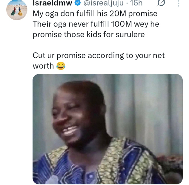 The controversy began when Israel DMW, Davido’s long-serving logistics manager and confidant, took to X (formerly Twitter) with a pointed, albeit subtle, remark. “My oga don fulfill his 20M promise. Their oga never fulfill 100M wey he promise those kids for Surulere. Cut ur promise according to your net worth 😂,” Israel DMW’s post read. This statement explicitly praised Davido for his recent fulfillment while implicitly criticizing another prominent figure for a perceived failure to honor a much larger commitment, instantly drawing parallels to past events.